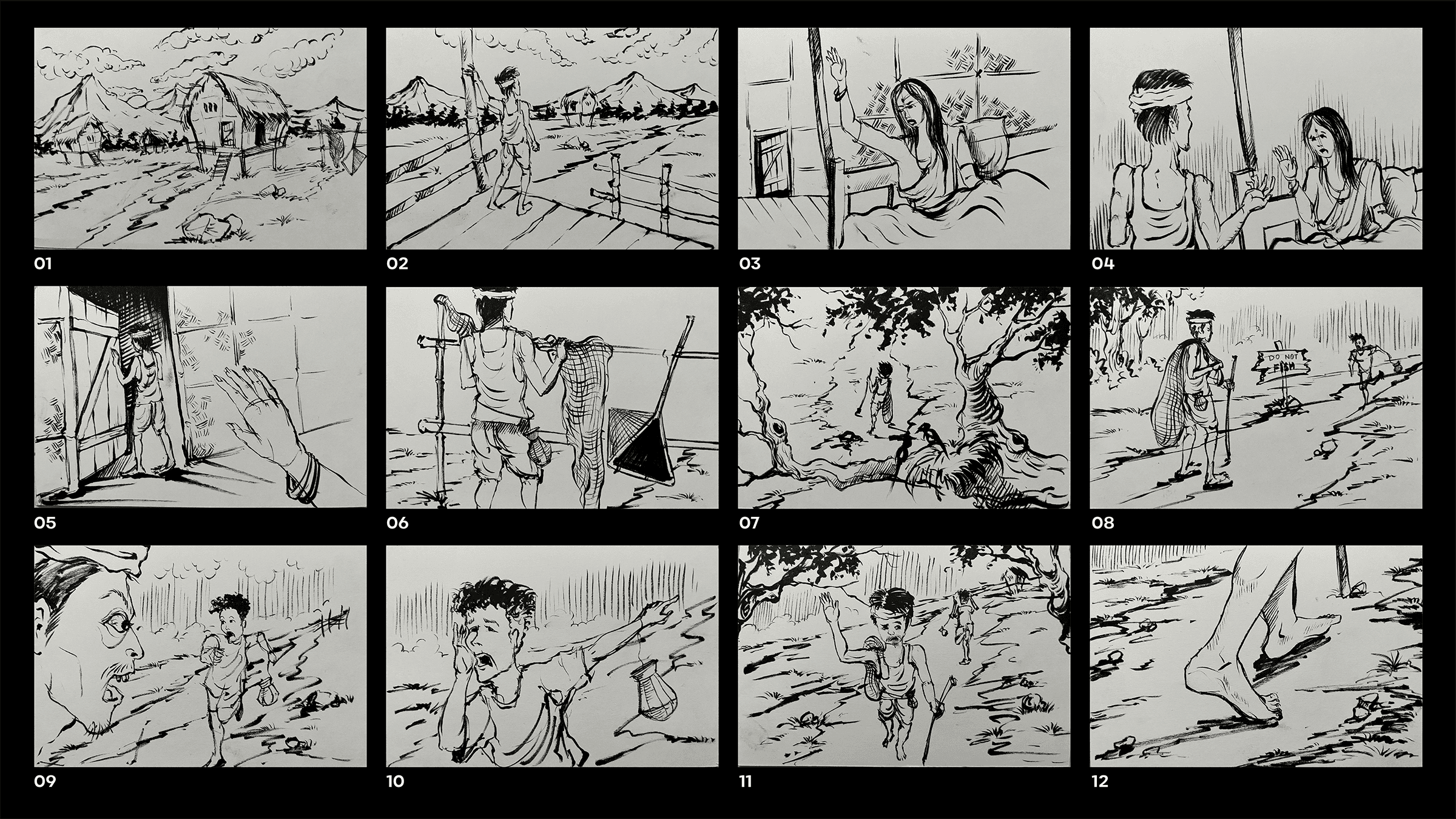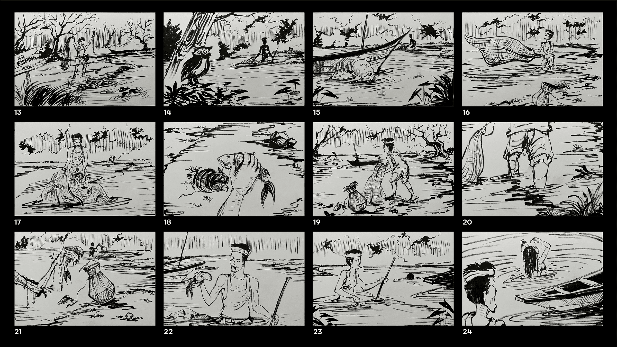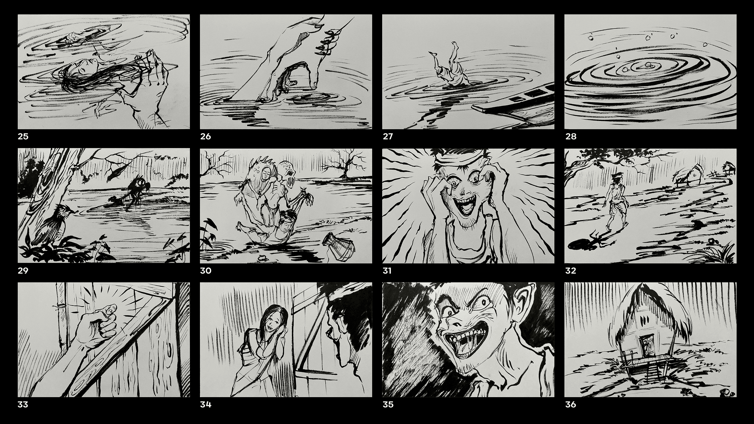 This is a storyboard I made for a Game Narrative. The story revolves around Assamese Folklore story of "BAAK" In Assam, locals have a deep-rooted fear of the Baak, a grotesque looking creature that inhabits ponds and lakes. It kills its victims, then hides the body deep underwater. This malevolent spirit occupies isolated spots where few people venture, and even fewer return from. The Baak is notorious for its murderous nature – after killing the victim and hiding the body, it takes on the corpse’s appearance and goes out in search of more prey. Many a time, people won’t even know that the person they’re with is not their brother/sister/ familiar, it’s a Baak that’s just leading them on so it can kill them too. It is said that the Baak carries a pouch containing its own soul. If one manages to grab that pouch, then the Baak will be under your command. If you can grab the Baak’s soul pouch, then you can have complete control over the Baak, like a genie. However, it’s no mean feat to get that close to one and live to tell the tale. Would be cool to have an evil genie to do your bidding though. Oh, and finally, for some reason, the Baak loves eating fish. One that subject, we can all relate. On the killing and identity theft however – not so much. That’s the story of the Baak. It looks terrifying, wants to kill you, and it’ll even steal your good looks.