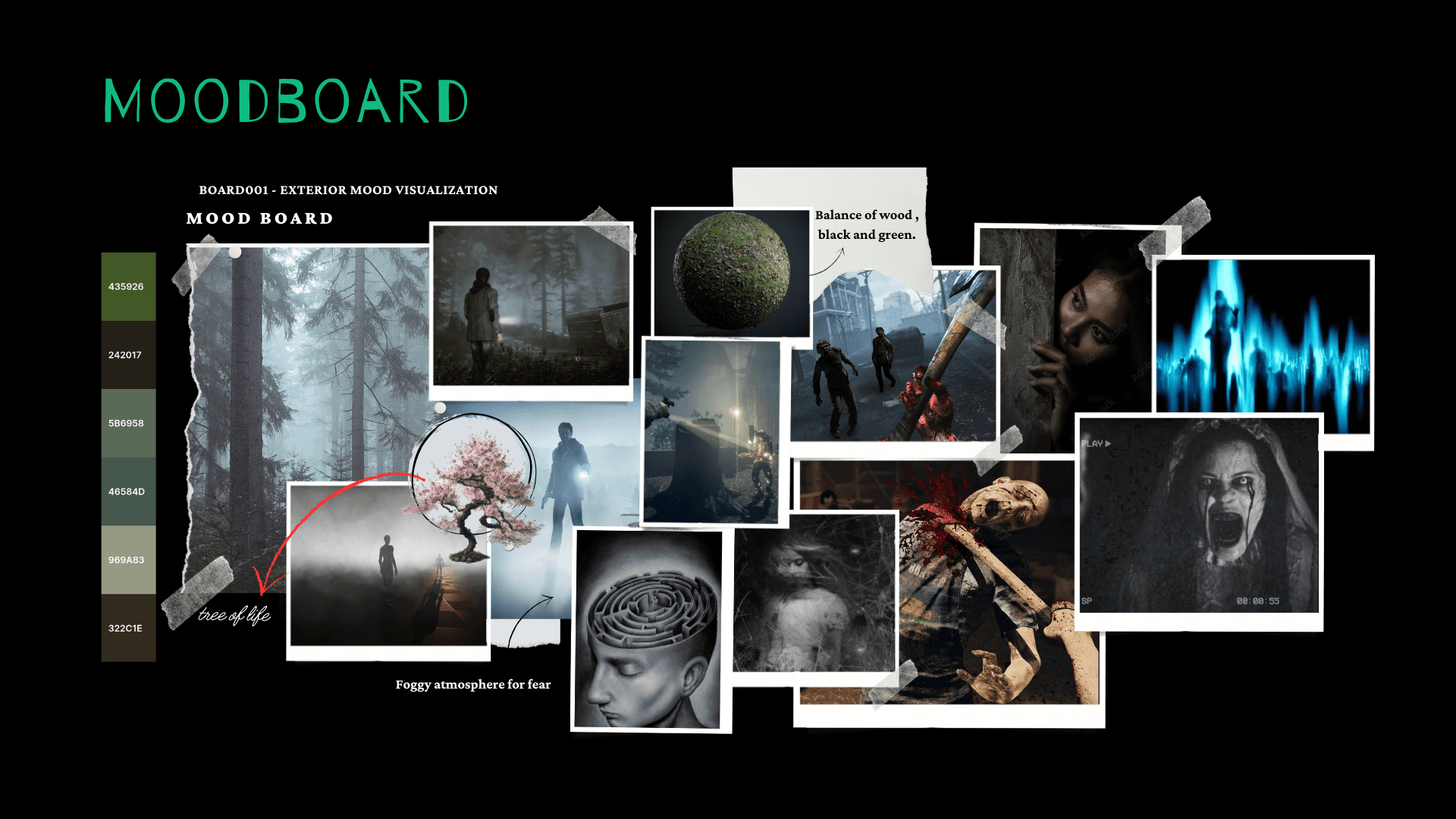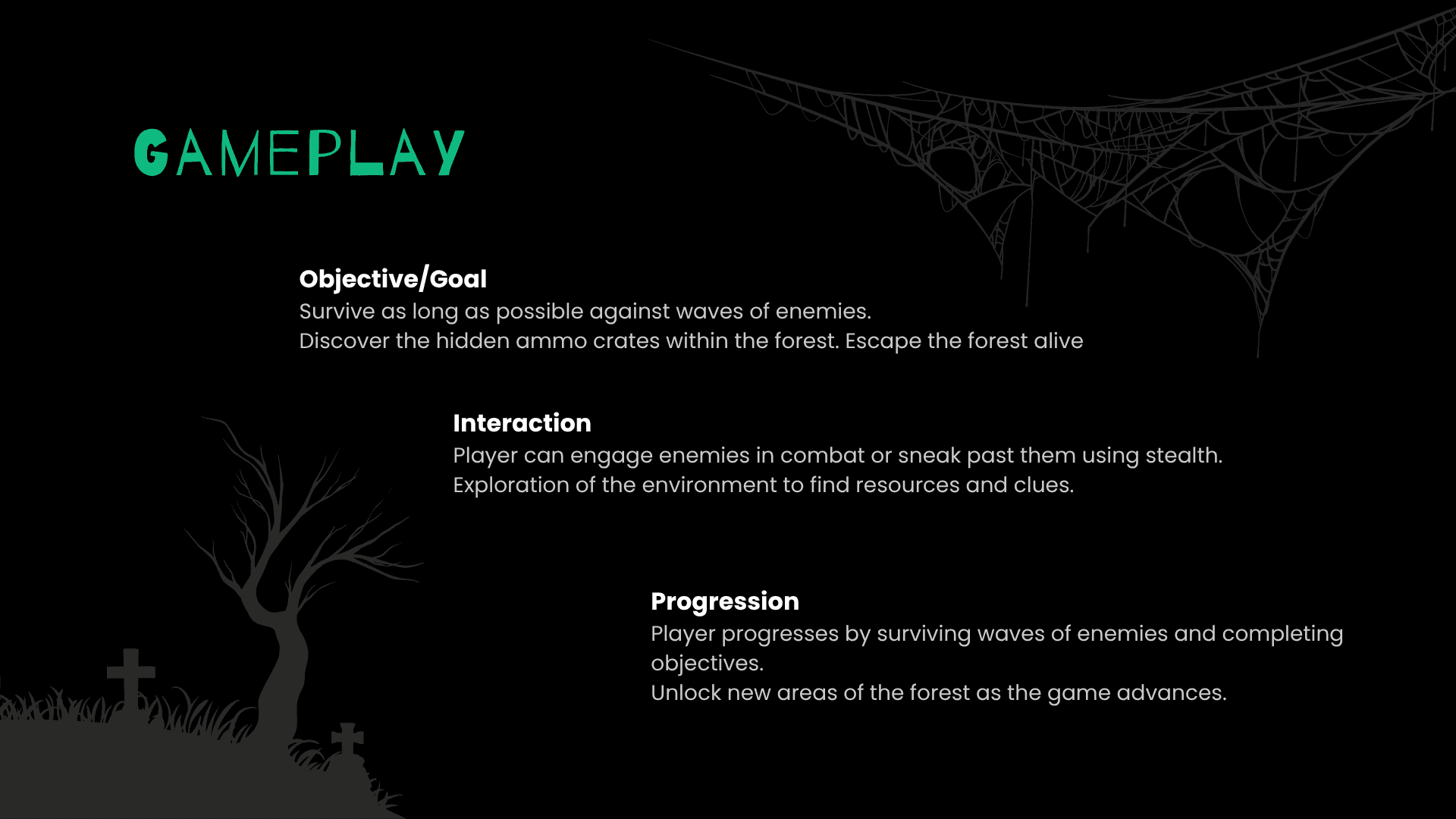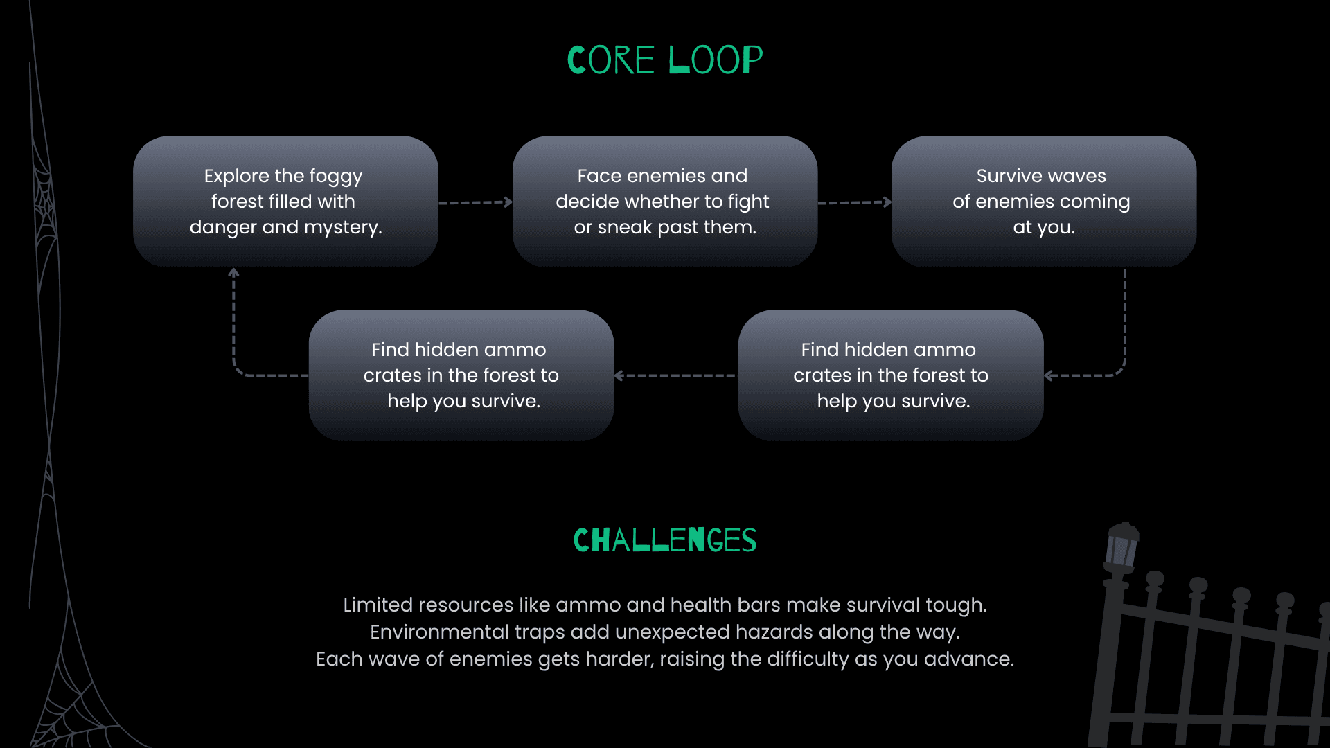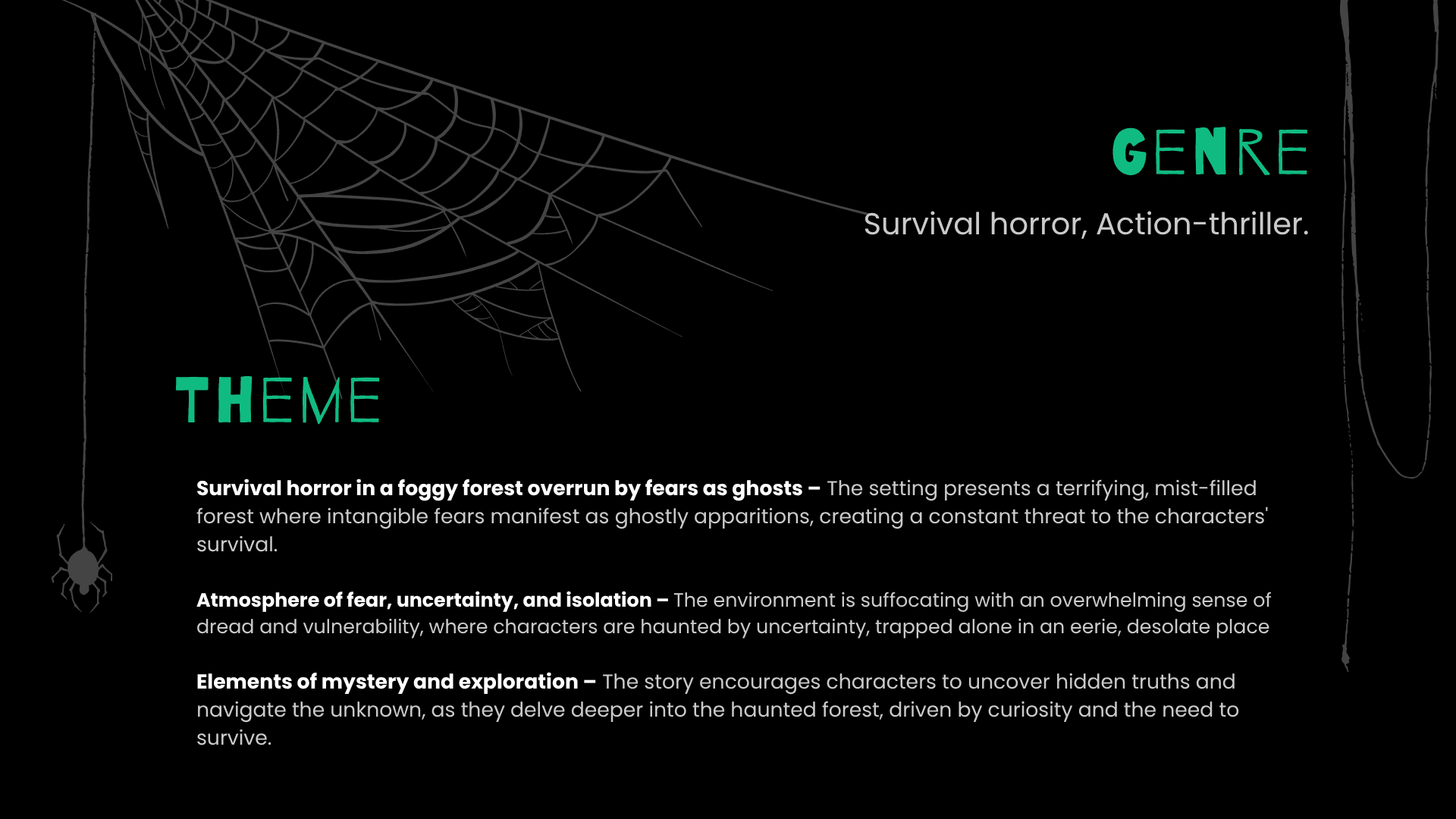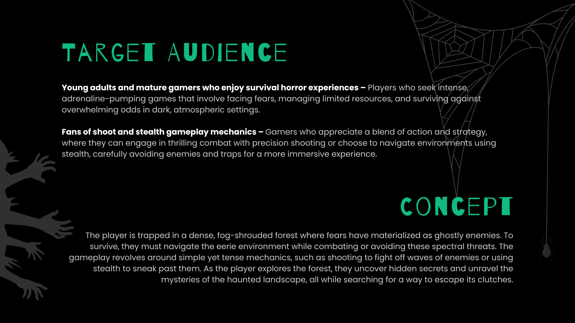 The player finds themselves lost in a dense, foggy forest infested with fears as ghosts. Must survive waves of enemies using simple mechanics like shoot or stealth. Explore the forest to uncover its secrets and find a way out, Made using Unreal Engine.