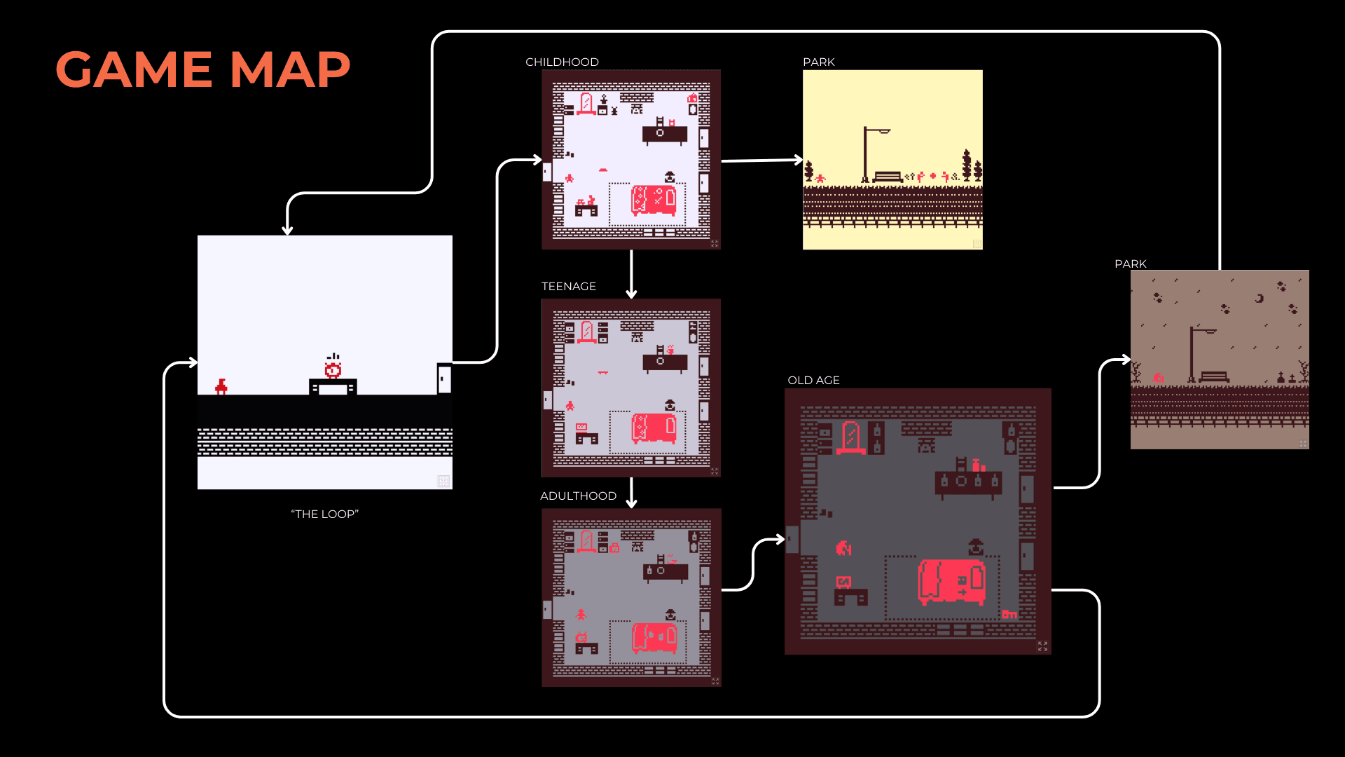 Game is about life's journey, from childhood to old age. You'll experience different stages like playing as a kid, facing challenges as a teenager, dealing with responsibilities as an adult, and reflecting on memories in old age. Each stage brings unique emotions and experiences. The game loops, so you'll keep going through the stages, seeing how life changes and stays the same.