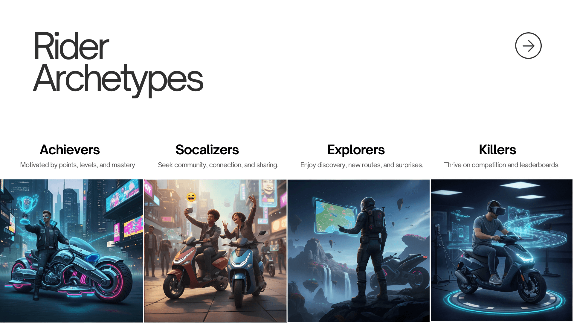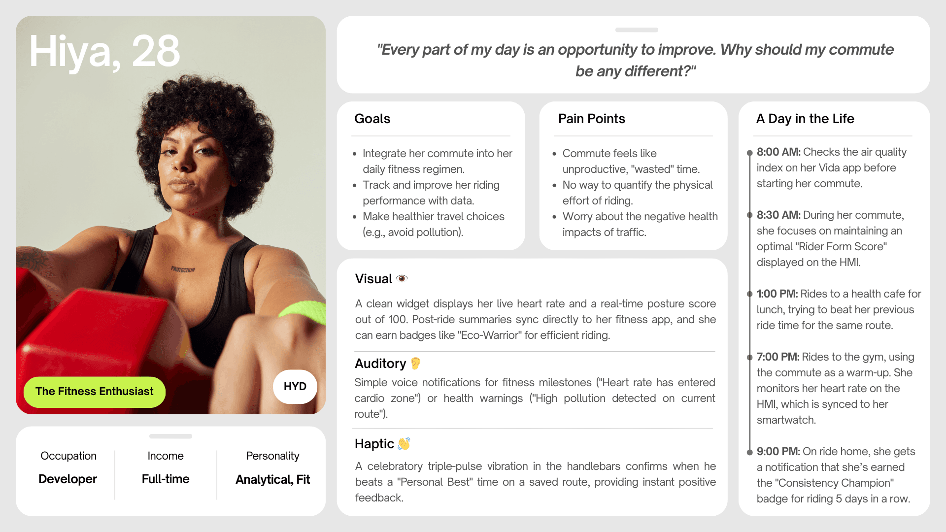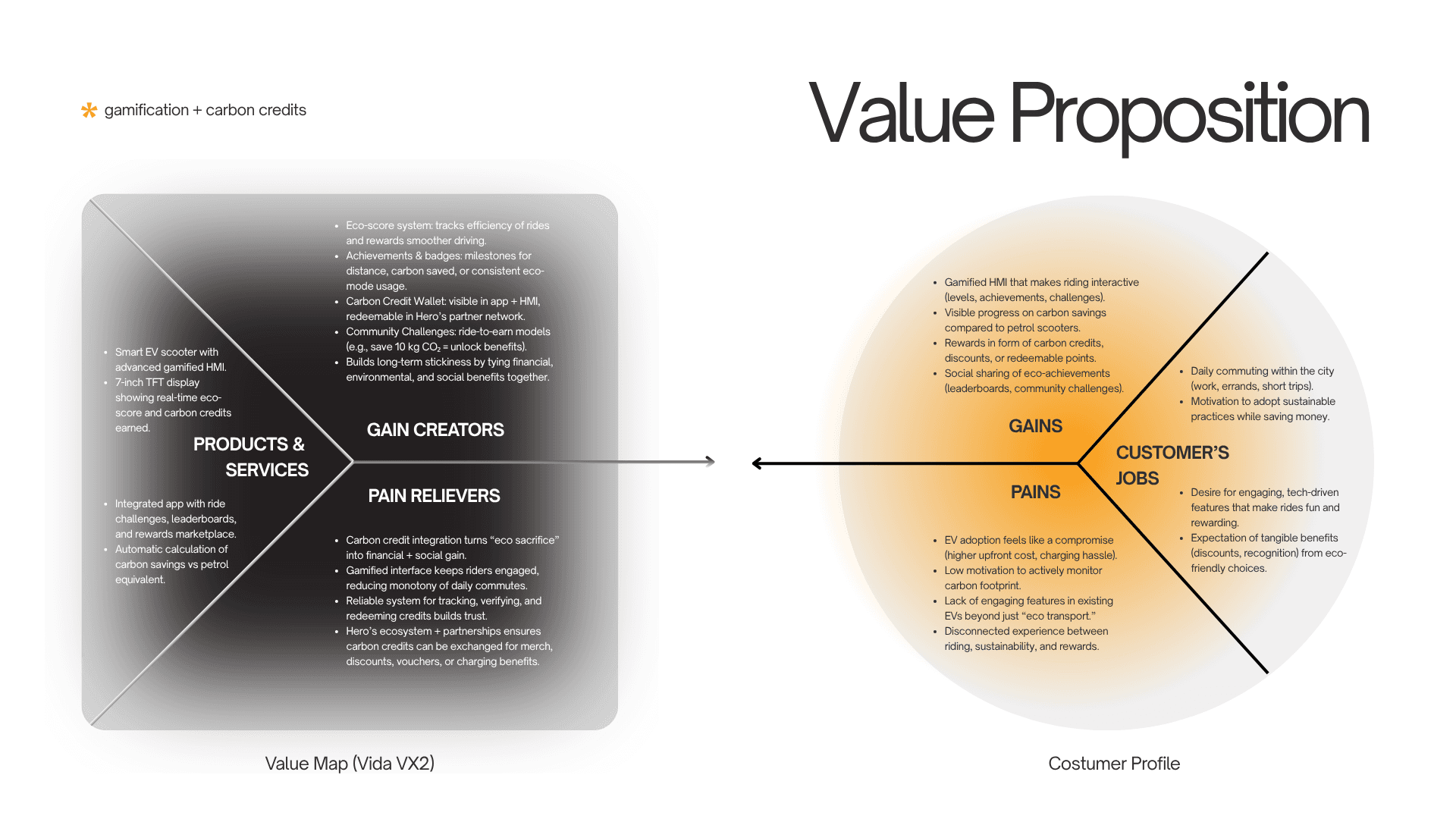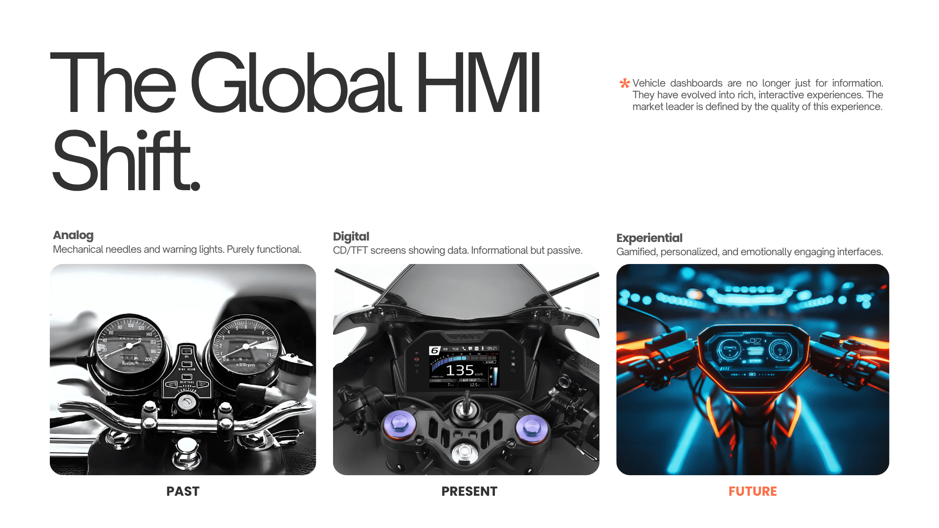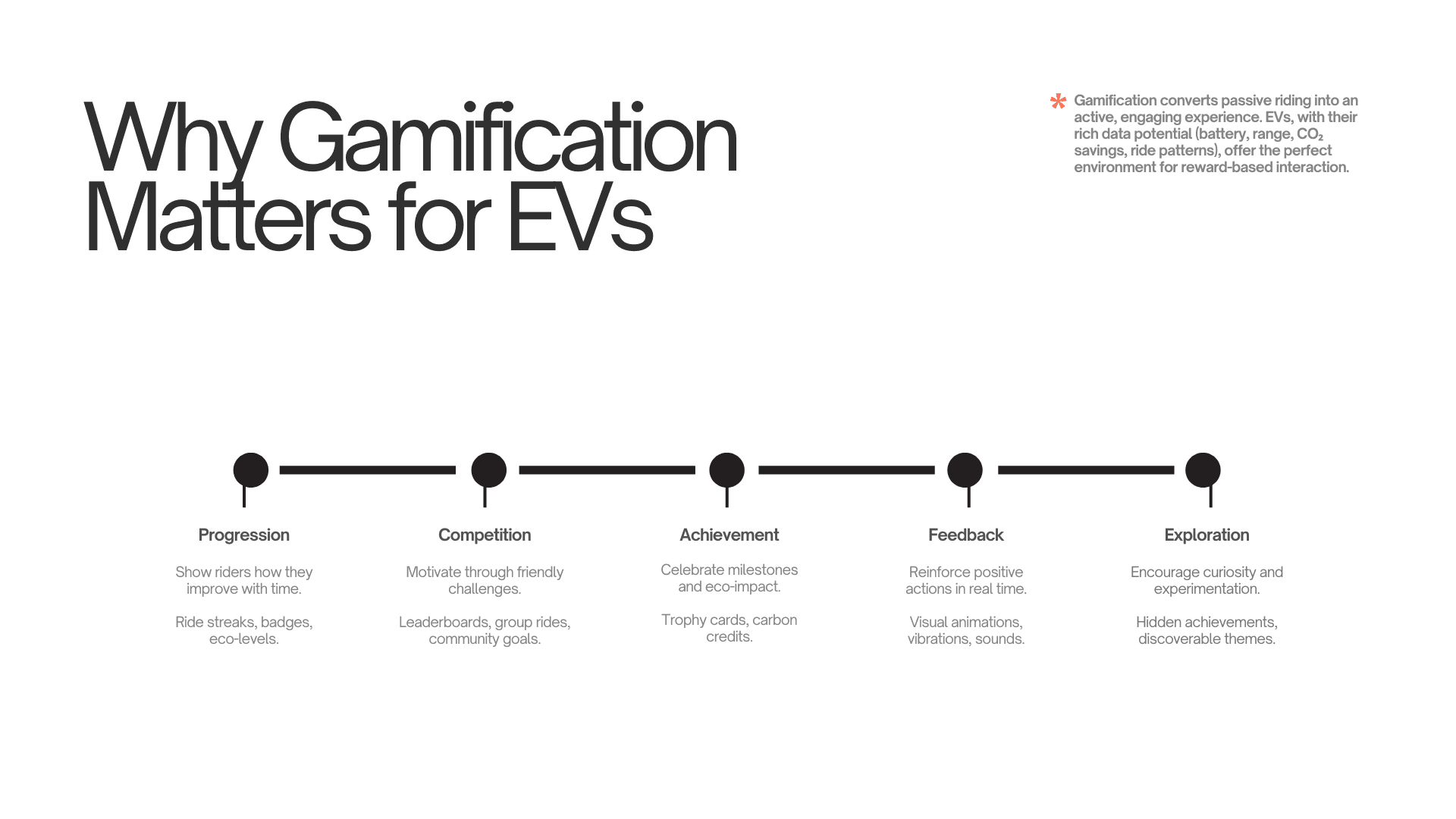 A user-centered EV HMI (instrument cluster) that integrates gamification and behavioral design to create an intuitive, motivating, and emotionally engaging riding experience, one that promotes safety, energy efficiency, and sustainable habits through interactive feedback.