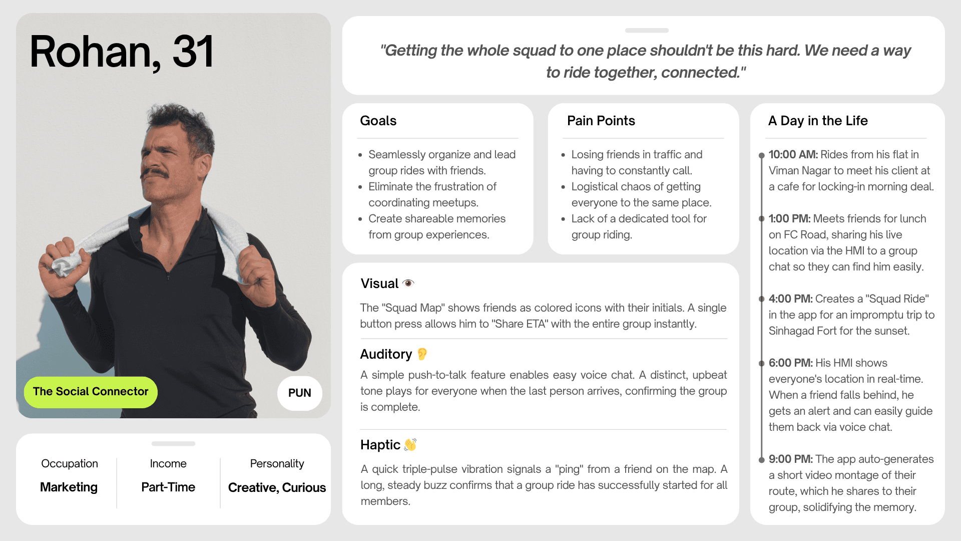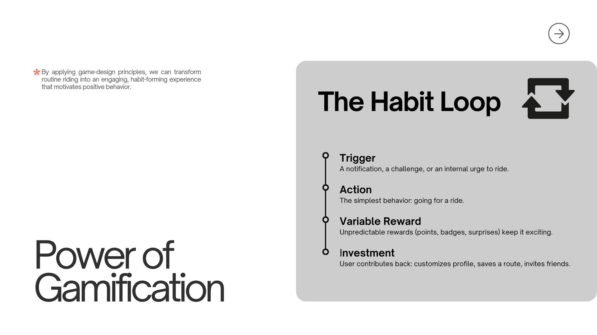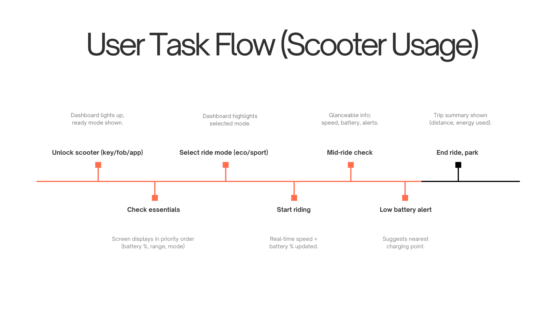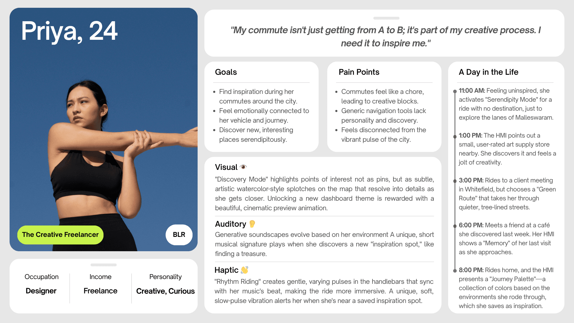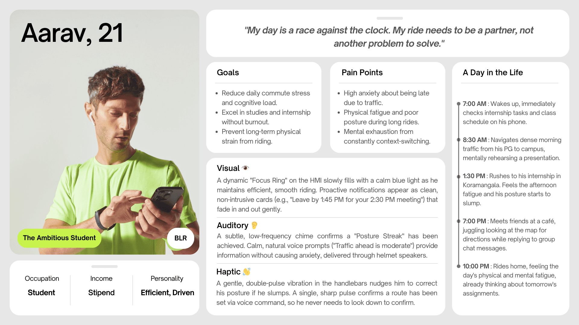 A user-centered EV HMI (instrument cluster) that integrates gamification and behavioral design to create an intuitive, motivating, and emotionally engaging riding experience, one that promotes safety, energy efficiency, and sustainable habits through interactive feedback.