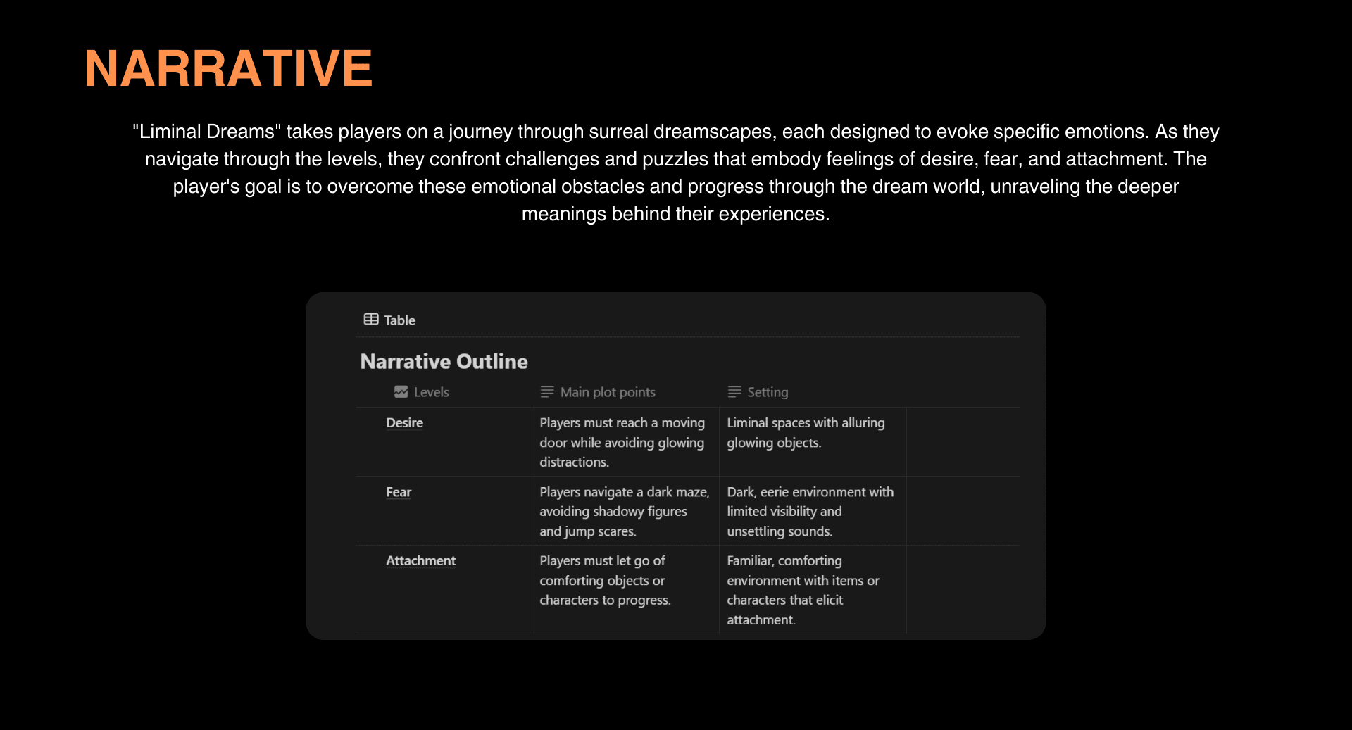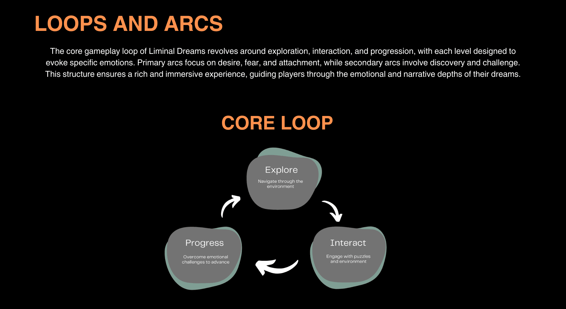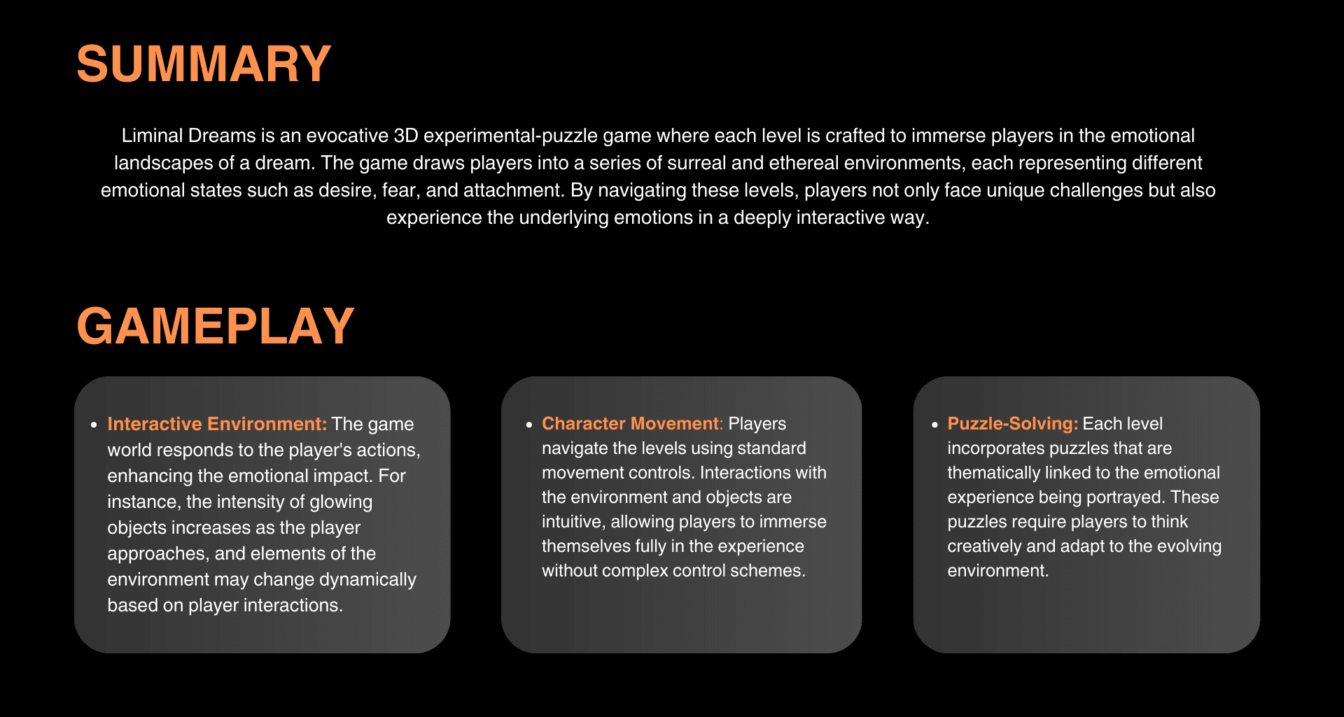 Liminal Dreams is an evocative 3D experimental-puzzle game where each level is crafted to immerse players in the emotional landscapes of a dream. The game draws players into a series of surreal and ethereal environments, each representing different emotional states such as desire, fear, and attachment. By navigating these levels, players not only face unique challenges but also experience the underlying emotions in a deeply interactive way, its still in the Prototype phase.