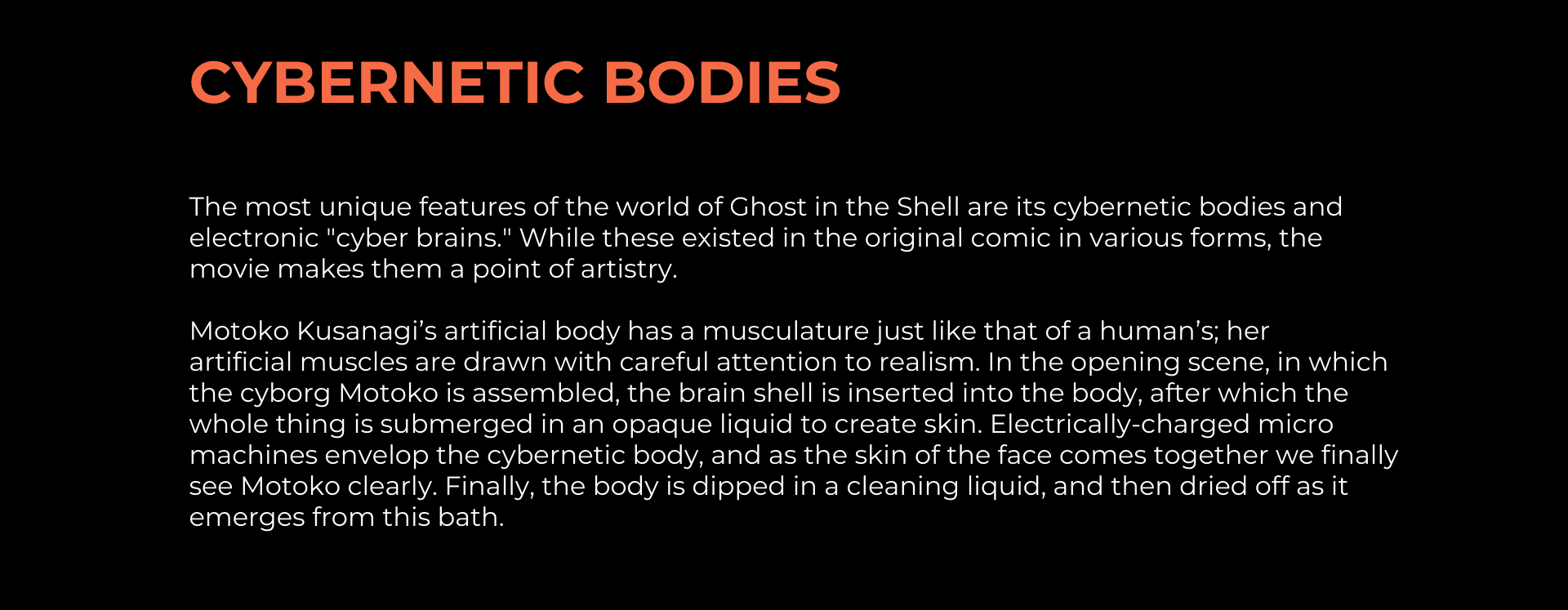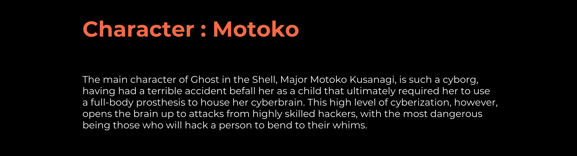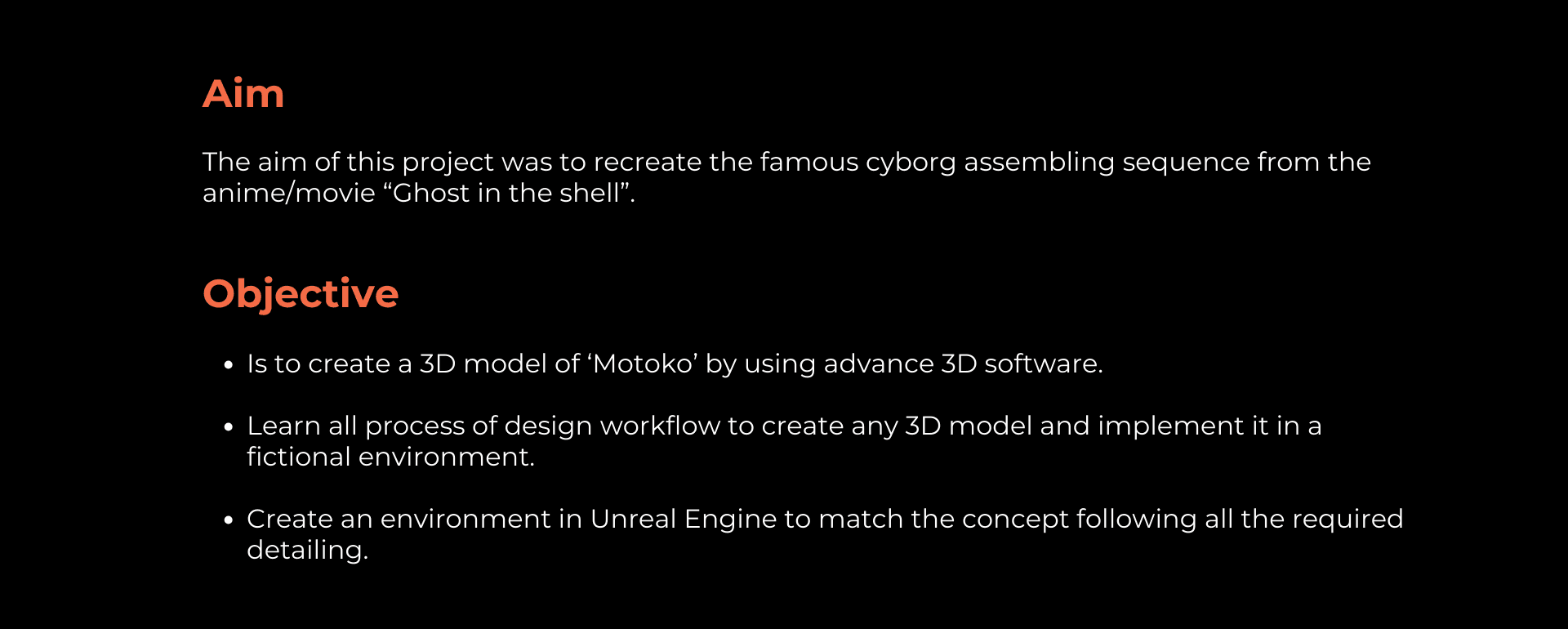 Character Details: The main character of Ghost in the Shell, Major Motoko Kusanagi, is such a cyborg, having had a terrible accident befall her as a child that ultimately required her to use a full-body prosthesis to house her cyberbrain. In this Project, I've showcase my model of Mokoko in its original settings, I tried replicating the original Ghost in the Shell using unreal engine. Also, this project was created in a very short amount of time with only me working on pre to post production. In this Project I created custom normal maps to embed my drawn design into the player.